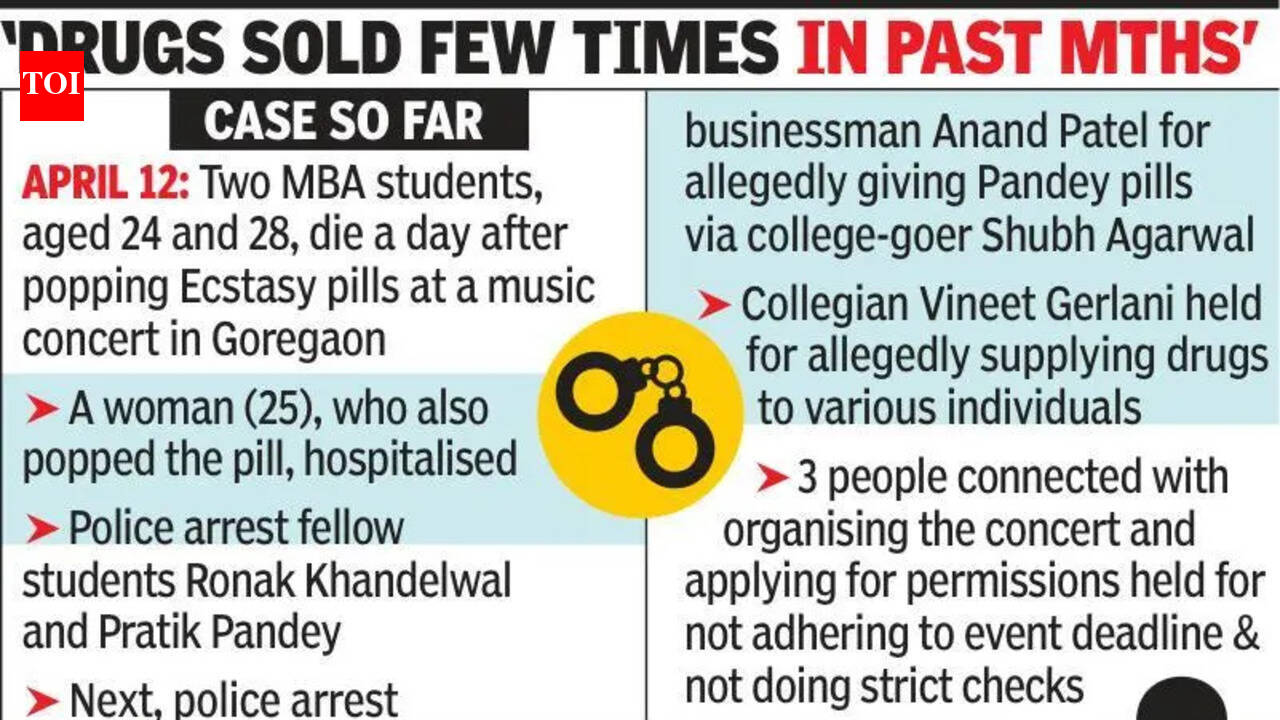 Mumbai: Police on Friday arrested a 21-year-old collegian based out of Kalyan in connection with the suspected drug overdose case where two MBA students lost their lives and a third is critical. Shubh Agarwal is the eighth person to be arrested in this case and was remanded to police custody till Monday by a magistrate court at Borivli.Police said Agarwal had delivered Ecstasy pills to the residence of one of the co-accused, Pratik Pandey. By questioning Agarwal, police hope to track down the whereabouts of the mastermind, who is currently on the run.A 28-year-old man and a 24-year-old woman—part of a group of 19 MBA students from a management institute —took ill after popping the pills at a music concert in Goregaon East on April 11. The duo died at different hospitals the next day while a third student—a 25-year-old woman— remains hospitalised. Police arrested two of their fellow students—Pandey and Ronak Khandelwal—for allegedly providing the drugs. Pandey told investigators that a construction businessman from Kalyan, Anand Patel, supplied him with 20 pills. Police arrested Patel after learning that the pills were sent through an online courier app. Further investigations showed that some of the pills were also sent by Patel to Pandey through Agarwal. These were packed in boxes and delivered to Pandey’s home in Charni Road by Agarwal.Investigators said Agarwal, who studies at a management college in Andheri, was also present at the music concert, along with the mastermind. The police’s remand application submitted before court said they need to inquire whether Agarwal picked up narcotics from anyone else and delivered them in a similar manner and whether there were any financial transactions between him and the rest of the accused persons.“From inquiries made with Pandey, we have learnt that drugs were bought a couple of times in the past three to four months,” said a senior police official. Police are investigating whether the drugs were sourced from around Kalyan as Patel, Agarwal as well as Pandey’s family are based out of Kalyan. Patel and Agarwal’s lawyers, Azad Gupta and Surendra Landge, said the duo had been arrested only because of their acquaintance with Pandey.