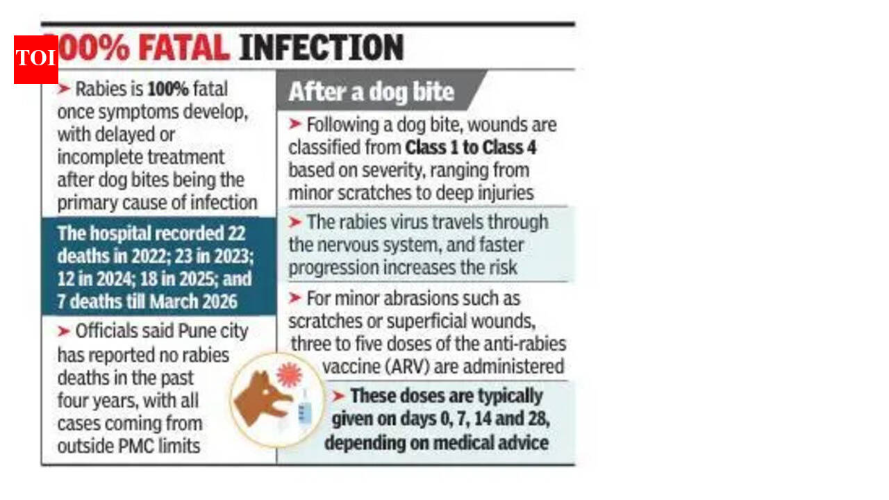 Pune: The civic body’s Dr Naidu Infectious Disease Hospital has admitted 82 rabies patients between 2022 and March 2025. All the patients were brought in from the peripheral and rural areas after symptoms had already appeared.Pune district health officer Dr Ramchandra Hankare said most patients who contract rabies either fail to treat their wounds properly or receive incomplete treatment.Rabies is a 100% fatal viral disease once clinical symptoms appear and is responsible for nearly 20,000 deaths annually in India.According to data from Naidu Hospital, there were 22 rabies deaths in 2022; 23 in 2023; 12 in 2024; 18 in 2025; and 7 deaths reported till the end of March 2026.“As per municipal data, around 60,000 doses of anti-rabies vaccines are required across all civic hospitals. These vaccines are procured through local tenders issued by the corporation. Anti-rabies injections are provided free of cost at all municipal hospitals. In private clinics, the cost of a vaccine dose ranges between Rs 300 and Rs 400, while immunoglobulin injections start at Rs 4,000. In cases of deep or bleeding wounds, immunoglobulin serum is administered in conjunction with the vaccine. PMC has not reported any rabies-related human deaths within city limits in the past four years. The cases reported at Naidu Hospital are from outside PMC limits, sometimes even from outside Pune district,” said Dr Sanjeev Wavare, assistant health officer, Pune Municipal Corporation (PMC).“As Naidu Hospital is the state’s primary infectious diseases isolation centre, all patients showing rabies symptoms are referred here. In rural areas, we have sufficient stock of anti-rabies vaccines and immunoglobulins at rural, sub-district, maternity, and district hospitals. Patients are referred to Naidu only after they begin showing symptoms and require isolation,” Hankare added.He further said that if a canine bites a person, the wound must be washed immediately with soap and water, and the anti-rabies vaccine should be administered without delay.“Depending on the severity and location of the wound, vaccination within 24 hours is critical. If required, immunoglobulin is administered at a secondary care centre. Medical officers have also been instructed to procure vaccines locally in case of shortages,” he added.
