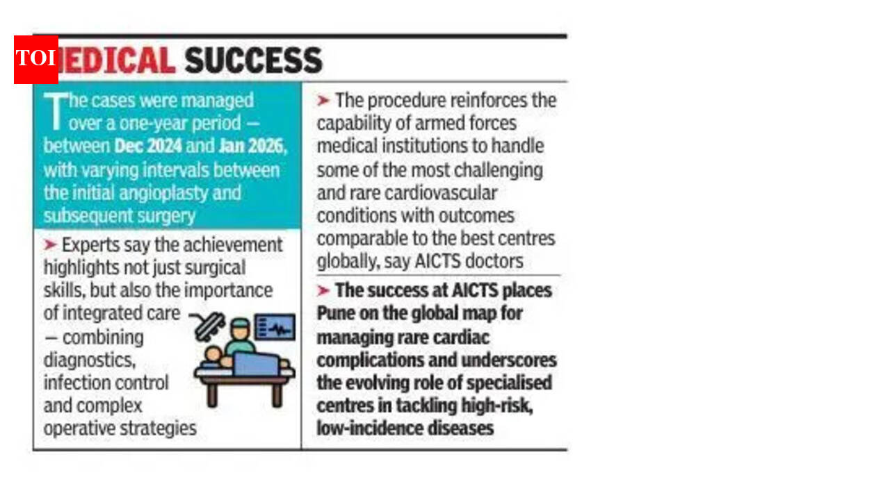Pune:A team of doctors from the Army Institute of Cardiothoracic Sciences (AICTS) successfully treated four patients suffering from an exceptionally uncommon and life-threatening condition called coronary stent infection of which fewer than 50 cases have been documented globally.The condition is medically referred to as post-percutaneous coronary intervention, coronary artery aneurysm or coronary stent infection. It is associated with high mortality and remains poorly understood, because it is rare. The four patients had undergone angioplasty procedures at different civil and private hospitals initially, before being referred to the AICTS for advanced management.Each case presented unique surgical challenges that required meticulous planning and execution between Dec 2024 and Jan, said doctors.A senior cardiothoracic surgeon at AICTS told TOI: “”The complication is extremely rare and potentially fatal. Globally, the evidence is limited to isolated case reports and small series. Managing even a single case is demanding, treating four successfully was significant. All of them have recovered well.”The surgical approach involved either extraction or exclusion of the infected coronary stent aneurysm, followed by coronary artery bypass grafting beyond the affected segment to restore blood flow. Procedures lasted between three-and-half to five hours, depending on the complexity.According to medical literature, coronary stent infections carry mortality rates of up to 40%, particularly when diagnosis or intervention is delayed. The rarity of the condition often leads to under-recognition, increasing the risk of severe complications, including sudden cardiac death.Former head of the department of heart surgery at the BJ medical college Avinash Inamdar told TOI: “Such cases are rare. The fact that it could be treated is a big positive. One or two such patients had approached us for consultation in the past. However, AICTS’s success could help provide standard operating procedures, which will be useful for private hospitals too. It is a boon for cardiologists in India.”“Early diagnosis is critical. The infection can happen within days of stent placement.The onset ranged from as early as one day to about two weeks in our four patients,” said another doctor involved in the treatment.All patients had received drug-eluting stents earlier. Experts said these may carry a higher risk of infection due to delayed healing of the vessel lining. It can leave parts of the stent exposed, creating a potential site for bacterial colonisation.Doctors attributed such infections to multiple risk factors, including breaches in sterile protocols, repeated vascular access, prolonged catheter use or existing infections elsewhere in the body. The most common pathogens suspected are Staphylococcus aureus and Pseudomonas species.The treatment protocol at AICTS combines early imaging with aggressive medical and surgical intervention. Coronary angiography is used as the first-line diagnostic tool, followed by CT coronary angiography for surgical mapping and PET-CT scans to pinpoint infection sites. Patients are treated with a four-week course of targeted antibiotics. However, in cases involving complications such as aneurysm formation or persistent infection, surgery becomes unavoidable.A member of the doctor’s team said, “Surgical management involves complete removal of infected material, debridement of surrounding tissue and revascularisation through bypass grafting. Precision is key because of the high-risk anatomy involved.”