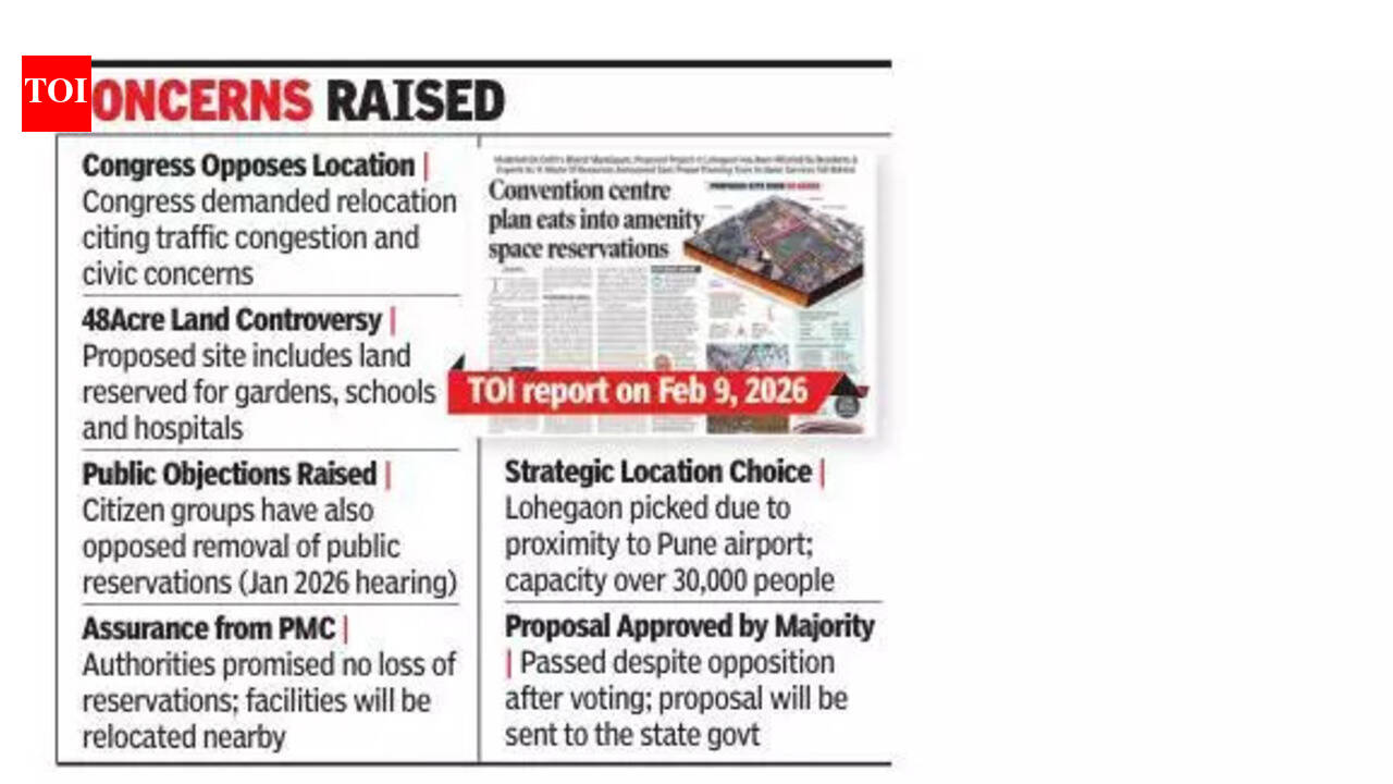 Pune: The BJP and NCP on Monday came together during the Pune Municipal Corporation (PMC)’s general body meeting to support the proposed convention centre, Bharat Mandampam, across 48acres in Lohegaon.The Congress opposed the proposal and demanded a change in the centre’s location. The party cited traffic problems and said the particular area in Lohegaon should not be considered. Members also pointed out that some plots on the 48acre land are reserved for gardens, school, hospital and other facilities.Citizens groups have already opposed the allotment of land for the centre by removing public reservations. The objections were raised during a hearing conducted in Jan 2026.Meanwhile, leader of the house in PMC Ganesh Bidkar assured the general body that no public reservations would be eliminated while executing the Bharat Mandapam project. “We will ensure that reservations are fully executed. Parking and gardens will be provided within the convention centre, while school and hospital will be developed in the vicinity. We will tell the administration toprepare a plan to execute the reservations,” he said. The proposal was approved on Monday and will now be sent to thestate govt for furtherconsideration.The state govt has proposed the project of the convention centre to be developed on the lines of Bharat Mandapam in New Delhi. Bidkar said Lohegaon was selected due to its proximity to the airport. The centre will be able host programmes with more than 30,000 people in attendance, though the designing and other details would be finalised by the state govt.Congress party members, including Arvind Shinde and Ramchandra Kadam, said the proposal should be scrapped as it is being implemented by removing reservations meant for citizens. Lohegaon is a fast developing neighbourhood and citizens already face a lot of problems, including traffic congestion. They said the party was not opposed to the Bharat Mandapam project, the objections were only regarding the location. Shinde and Kadam also highlighted that citizens and various civic departments had also protested against the removal of reservations and the specified location.A voting was held on the issue and, despite Congress’s objections, the proposal was approved by a majority with BJP and NCP standing in support.Leader of opposition and NCP leader Nilesh Nikam said the administration should give an assurance that all reservations scrapped for the centre would be implemented in nearby areas.