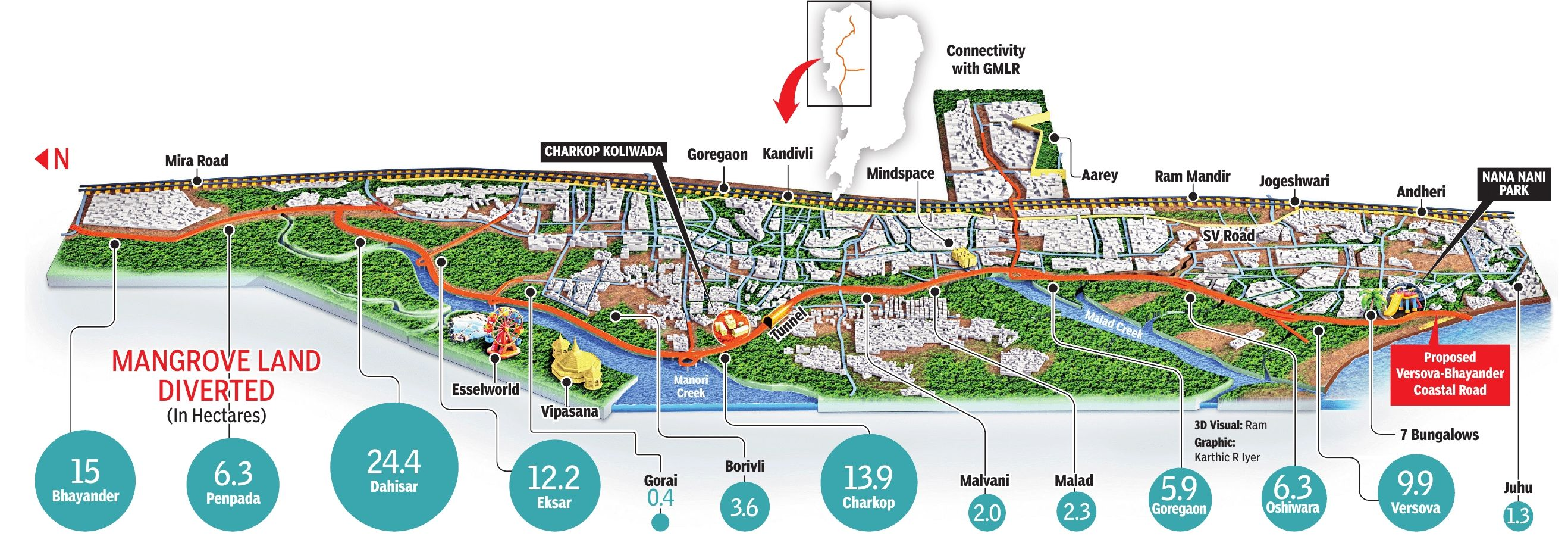 The original habitat can still be glimpsed, however, in the small village farm, with its vegetables and mango trees; the mud flats that double up as a cricket pitch at low tide; and the shrinking patches of intertidal mangrove. These patches served as important sponges during the deluge of 2005, when the nearby Poisar river flooded, says Satam. One problem, she adds, is that while creek mangroves have been classified as reserved forest, the intertidal mangrove patches closer to urban development remain unrecognised, and at risk.The coastal road project includes a plan to restore the mangroves and creek in some places once the work is done. But such restoration isn’t easy, and could take many years, say locals. The authorities have not yet offered compensation to Anil and others who depend on fishing here, including some 75 women involved in selling, either locally or at the Malad fish market. “If the environment for fish is gone, then fishing is gone,” says Dipti Bhandari, head of the local mahila mandal.Like many of the younger families here, Dipti and her husband, Dhiraj, are no longer actively involved in fishing. But the couple helped revive the long-dormant Macchimar Samitik more than a year ago to represent the community’s concerns better. Dipti is from the Worli koliwada, which put up a fight five years ago over the coastal bridge there. Even now, she says, prawn fishing hasn’t fully recovered off Worli’s waters. Says Dhiraj, “This government puts a lot of value on cars and roads, but don’t mangroves and fish also have value?”