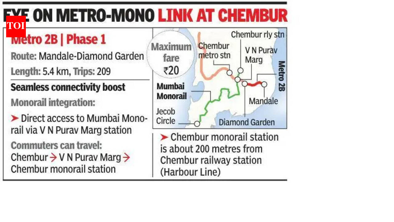 Mumbai: The Mumbai Metropolitan Region Development Authority (MMRDA) has asked the Commissioner of Metro Rail Safety (CMRS) to begin inspection of the Metro Line 2B extension up to Chembur metro station on the Sion-Trombay Road, as it moves to operationalise a crucial interchange with the monorail network, which has remained shut since Nov 2023 following a major technical snag.The proposed Chembur station, located next to the operational Diamond Garden station, will extend the Phase I stretch between Diamond Garden and Mandale, opened on April 8. Officials said the extension is aimed at strengthening connectivity in the eastern suburbs while enabling seamless integration with the monorail.An MMRDA official said, “We are targeting to open this stretch this monsoon.”The Chembur metro station is within 100 metres of the V N Purav Marg monorail station, allowing commuters to easily switch modes. This integration is expected to particularly benefit passengers heading towards Chembur and south Mumbai. Commuters alighting at Chembur metro station can take the monorail from V N Purav Marg to reach Chembur monorail station, which is about 200 metres from Chembur railway station on the Harbour Line, enabling further rail connectivity.The monorail corridor also extends up to Mahalaxmi at Jacob Circle, offering a direct link to south-central Mumbai. From Mahalaxmi, commuters can access Metro 3 (Aqua Line) to travel towards Worli and Cuffe Parade, thereby creating a wider multimodal network once services resume.Work on the Chembur metro station is at an advanced stage, with staircases and access infrastructure nearing completion. Sources said MMRDA is awaiting the CMRS inspection schedule, after which the extension could be opened to the public.The authority expects the extension to boost ridership on Line 2B due to its location near Swastik Park junction, which offers connectivity to Kurla via BEST buses and autorickshaws.Line 2B recorded an average daily ridership of 3,992 during the period between April 8 and 14.Officials added that Line 2B will eventually connect with the Bandra-Kurla Complex (BKC) and integrate with the existing Metro Line 2A between Andheri West and Dahisar, significantly strengthening east-west connectivity across the city.
