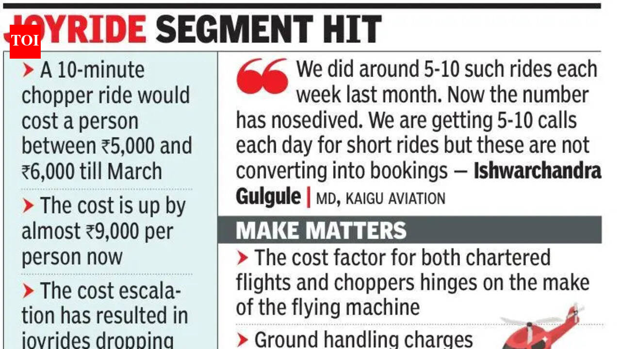 Pune:A cool chopper ride to Mumbai or a dash to Delhi on a chartered flight has become dearer by 30-40% in April — T S Eliot’s “the cruellest month”.Reason: The West Asia conflict-induced price hike of aviation turbine fuel (ATF). End-result: Decline in customer base of operators.Ishwarchandra Gulgule, the managing director of Kaigu Aviation, toldTOI, “Earlier, one had to spend around Rs3.5 lakh to Rs4 lakh to hire a chopper to Mumbai. The fare has spiked to almost Rs5.5 lakh in April, excluding the 18% GST.”The ATF price surged to record high in India in April.Its price for non-scheduled and chartered operations more than doubled this month to Rs 1,94,968.67 per kilolitre from Rs90,451.87 per kilolitre in Mumbai.American-English poet, playwright and literary critic Eliot called April “the cruellest month” in “The Waste Land” because spring forced life to come back again. Flyers can term this month “rude” because of the upward revision of ATF price and the subsequent hike in airfares.Gulgule said, “The inauguration of the Navi Mumbai International Airport resulted in an increase in the aerial travel time between the two cities on a chopper from the earlier 45 minutes to an hour. First, this increased the fare. The higher ATF price because of the West Asia conflict jacked it up further.”The average weekly chopper movements between Pune and Mumbai are around 25-30. Mainly politicians, businessmen and entrepreneurs are the clients.There has been an identical price hike of chopper rides on Pune-Solapur, Pune-Kolhapur and Pune-Sambhajinagar routes. “The fares are about the same on these routes and so is the hike,” Gulgule said.“Most of our regular customers are still using choppers, but a dip is slowly being seen. What is alarming is new customers are not coming now. We are getting 10-12 queries each day, but these are not converting into bookings. At this moment, we don’t know in which direction the business is heading,” Gulgule said.A representative of another aviation company said charter flight costs had also increased sharply. “For example, the cost of a trip from Pune to Delhi (one-way) was around Rs10 lakh earlier. Now, it’s almost Rs14 lakh barring the GST. Similarly, the cost of a one-way trip from Pune to Bengaluru costs Rs8 lakh or more now. Earlier, the pocket pinch was Rs6 lakh per trip. The cost factor for both chartered flights and choppers hinges on the make of the flying machine and ground handling charges,” the representative said.