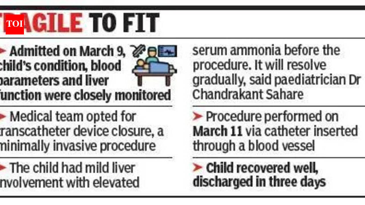 Pune: A one-and-half-year-old girl was successfully saved from a one in 50,000 rare congenital vascular condition called Abernethy Malformation wherein blood from the stomach and intestines directly flow into the heart, instead of being filtered and passing through the liver first.The antenataldiagnosis reflected the toddler’s condition and the surgery was challenging for the doctors.Dr Ashish Banpurkar, paediatric cardiologist, Vishwaraj Hospital, said, “In a normal child, blood from the stomach and intestines flows through portal veins to the liver where it gets filtered before entering the heart. However, in this case, the portal veins were bypassing the liver and were abnormally connected directly to the heart via Vena cava. Resultantly, the hepatic circulation was not well developed and there was a possibility of pulmonary hypertension and abnormal circulation (pulmonary AV malformation) developing. We planned an elective closure of the abnormal connection for the child.”He said that if left untreated, such an abnormal circulation could lead to complications affecting the liver, lungs and overall metabolism. “The child had been under observation and required admission due to mildly elevated blood ammonia levels, which were managed conservatively. During the evaluation, doctors diagnosed the child with the rare congenital condition known as Abernethy Malformation, also called a Congenital Portosystemic Shunt. Thechild was put through a minimally invasive cardiac procedure.”She was admitted on March 9 and the child’s clinical condition, blood parameters and liver function were carefully evaluated and monitored. The medical team decided to perform a transcatheter device closure, a minimally invasive procedure, saidDr Satyajit Funde, hospital radiologist.During the procedure on March 11, doctors inserted a catheter through a blood vessel and performed detailed angiography to measure portal venous pressure and blood flow dynamics.Cardiac anaesthesiologist Dr Vitthal Shendage said, “Once the team confirmed that the abnormal connection could be safely closed, a specially designed occlusion device was deployed to block the shunt. Post-procedure imaging and sonography confirmed that the device was correctly positioned and blood flow to the liver had been restored.”The child responded well to the procedure and was discharged within three days. “We expect normal circulation to continue, and the closure is considered a permanent solution with minimal chances of recurrence,” added Banpurkar.Consultant intensivist and paediatrician Dr Chandrakant Sahare said, “Prior to the procedure, the child had shown mild liver involvement with elevated serum ammonia levels and occasional increased nasal bleeding. With the abnormal connection closed now, the issues will resolve gradually.”Banpurkar emphasised the importance of early diagnosis and regular follow-ups in congenital conditions. “We were able to plan the treatment at the right time and perform the intervention safely because the child was monitored from the foetal stage.”