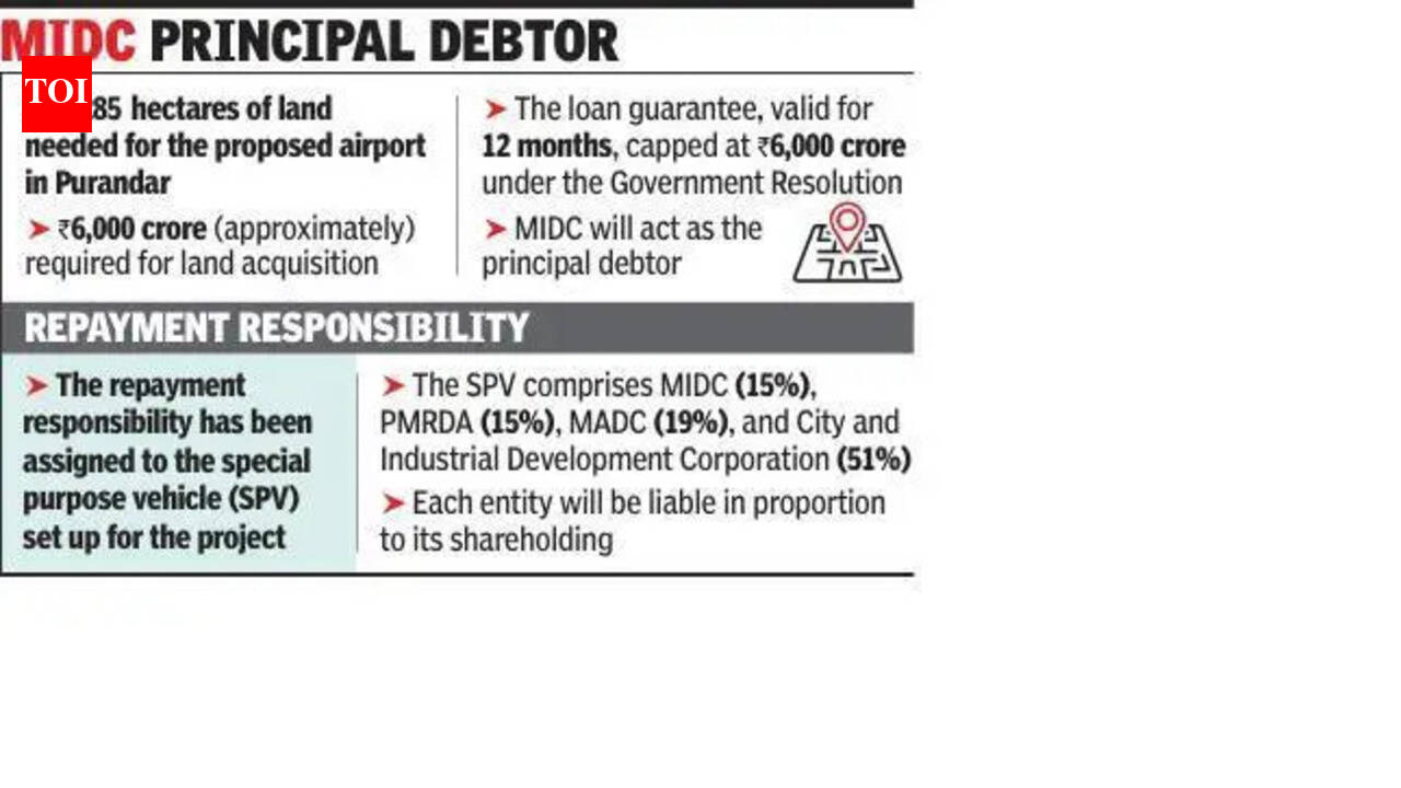 Pune: The state finance department on Friday issued a Government Resolution (GR) detailing terms for its Rs6,000 crore guarantee to fund land acquisition for the proposed Purandar airport.Emphasising on safeguards, liability clauses and monitoring norms, the GR allows Maharashtra Industrial Development Corporation (MIDC) to raise loans from Housing and Urban Development Corporation or other financial institutions at competitive rates. It also formalises the structure following the state cabinet’s Feb 10 approval and replaces an earlier order of the industries department.The greenfield airport project requires around 1,285 hectares (nearly 3,000 acres) of land across seven villages — Vanpuri, Kumbharvalan, Udhachiwadi, Ekhatpur, Munjavadi, Khanvadi and Pargaon — in Purandar. About Rs6,000 crore would be required for land acquisition.Under the GR, the guarantee is capped at Rs6,000 crore. It will remain valid for 12 months. MIDC will act as the principal debtor, and lenders cannot extend loans beyond the sanctioned limit without prior approval of the state government. Funds must be used strictly for land acquisition.The repayment responsibility has been assigned to the special purpose vehicle (SPV) set up for the project. The SPV comprises MIDC (15%), Pune Metropolitan Region Development Authority (15%), Maharashtra Airport Development Company (19%), and City and Industrial Development Corporation (51%). Each entity will be liable in proportion to its shareholding.“The GR seeks to ring-fence the state’s financial exposure. If the SPV fails to service the loan because of unavoidable circumstances, the government may step in after assessing its financial position, but the guarantee does not automatically translate into a direct burden on the state exchequer,” said an official from the state finance department.A key clause mandates lending institutions to report any default in repayment or interest within 90 days. Anny breach of conditions can render the guarantee invalid.The MIDC has been directed to raise only the required amount and ensure strict end-use compliance. It must submit audited accounts and periodic financial updates, while the SPV is required to furnish monthly repayment progress reports to the industries and finance departments.The GR prescribes a guarantee fee of 0.5% per annum on the outstanding amount, payable every six months. Delays will attract penal interest of 16% for the first three months and 24% thereafter, with payments to be deposited in the government treasury under a specified head.Officials from the industries and finance departments have been authorised to execute agreements with lenders and monitor compliance.