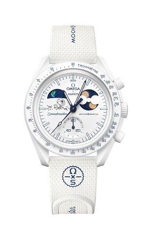 Dial: white opaline with OMEGA X Swatch, Speedmaster and MoonSwatch logos; recessed subdial, hour markers coated with Grade A Super-LumiNova (green emission).