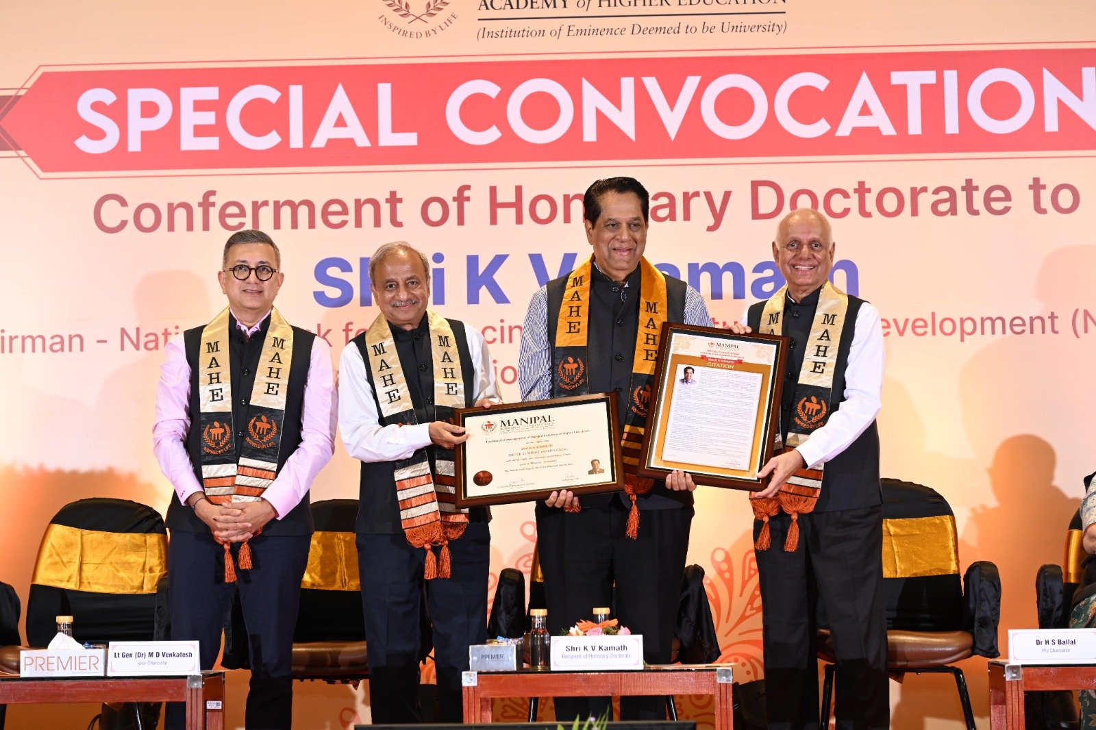 Manipal Academy of Higher Education (MAHE), Deemed to be University, one of India’s leading research-focused educational institutions, held a special convocation for conferring an honorary doctorate to Mr. K. V. Kamath, Chairman of National Bank for Financing Infrastructure and Development (NaBFID) & Chairman of Jio Financial Services Ltd. on Monday, 29 April 2024. The ceremony was graced by distinguished dignitaries like Mrs Vasanti R Pai, Trustee, MAHE Trust, Dr Ranjan R. Pai, President, MAHE Trust & Chairman, MEMG, Bengaluru, Dr H.S. Ballal, Pro-Chancellor of MAHE, Lt Gen (Dr) M.D. Venkatesh, VSM (Retd.), Vice Chancellor of MAHE, Dr Dilip G Naik, Pro Vice Chancellor, MAHE, Mangalore, Prof. Madhu Veeraraghavan, Pro Vice Chancellor, MAHE Bengaluru, Dr P Giridhar Kini, Registrar of MAHE among other senior officials of MAHE Trust, Board of Management, and Academic Council.