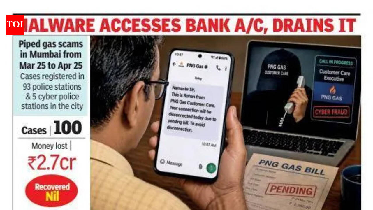More than 100 Mumbaikars aged 26 to 83 collectively lost over Rs 2.7 crore in a month. They included domestic help, teachers, drivers, lawyers, scribes, businessmen, govt employees, and the elderly.A 71-year-old doctor from Worli lost Rs 1.9 lakh on April 22 after he tried to book a gas cylinder online. He dialled a number he got on the internet and was told by the scammer that he had to download an app to register his booking. His banking data was stolen from his mobile phone and the money was siphoned off.A 33-year-old woman from Bandra lost Rs 2.6 lakh when she tried to book a new piped gas connection upon relocating to Bandra from Marol. The woman was asked to download the app after she called a number on which she received an alert about a pending gas bill payment on April 17.A 64-year-old Andheri-based salon owner lost Rs 3.8 lakh when he had gone to Howrah for a family function in March following a bill alert. A 72-year-old doctor from Andheri similarly lost Rs 9.5 lakh in April. Earlier in March, a 57-year-old Prabhadevi businessman lost Rs 9.8 lakh via 18 fraudulent transactions over a span of four days.State cyber DIG Sanjay Shintre said scammers used multiple ways to dupe people, either pretending to help in booking a new connection or on the pretext of updating bills.Explaining the modus operandi, Shintre said: “You receive an SMS or WhatsApp message claiming your gas bill is unpaid or hasn’t been updated. The message threatens imminent disconnection —often ‘tonight at 9:30 pm’— to create panic. A fraudster calls, posing as an official from a company like MGL or Indian Oil. They may use professional-sounding language or even mention current events like gas shortage to make the situation seem more credible. The scammer instructs you to download an ‘update’ or ‘verification’ file sent via WhatsApp. This is an APK file (for instance, MGL_GAS_Bill_update.apk) that contains malware. Once installed, the malware allows the attacker to remotely control your device and see your screen and intercept OTPs (one-time passwords) sent by your bank. They capture banking credentials while you try to make a nominal ‘verification payment’ of just Rs 10 or Rs 12. Within minutes of gaining access, the fraudsters perform multiple unauthorised transactions, often siphoning off lakhs.”Demand for piped gas connections has surged sharply. In Feb, around 16,000 new connections were added, while in March the figure crossed 33,000—more than double the previous month’s total. Sources said the spike in demand followed govt directives urging LPG consumers to shift to PNG wherever the facility was available.MGL officials said daily inquiries for domestic PNG connections rose two to three times compared to normal levels. MGL clarified it did not send disconnection threats through suspicious messages, ask customers to download APK files, or direct them to unknown numbers for bill-related updates.Cyber expert Ritesh Bhatia said, “Recovery in most cybercrime cases is almost nil because money is siphoned off instantly through mule accounts and layered transfers. Also, due to delayed reporting, weak inter-state coordination, and lack of real-time intervention by banks.” Cyber lawyer Prashant Mali said police must book fraudsters under BNS Section 111. Fast freezing, device forensics and mule account mapping are critical, he said. Ex-IPS officer-turned-lawyer YP Singh said APK fraud was on the rise due to the failure of banks and agencies to enforce technical vigilance and prevention.